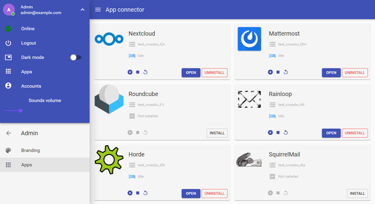 After logging in as admin@example.com, domain admins can access the "apps" menu, giving them full control over the applications running under their account. They can install, start, stop, or restart apps with a single click — and CrossBox handles the rest.