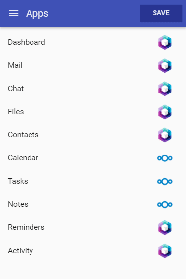Using the module mapping interface located in Settings -> Apps, each user can freely map modules to dedicated apps. For example, a user can choose CrossBox for email but Nextcloud or Horde for the calendar. Users can also choose to disable certain modules entirely.